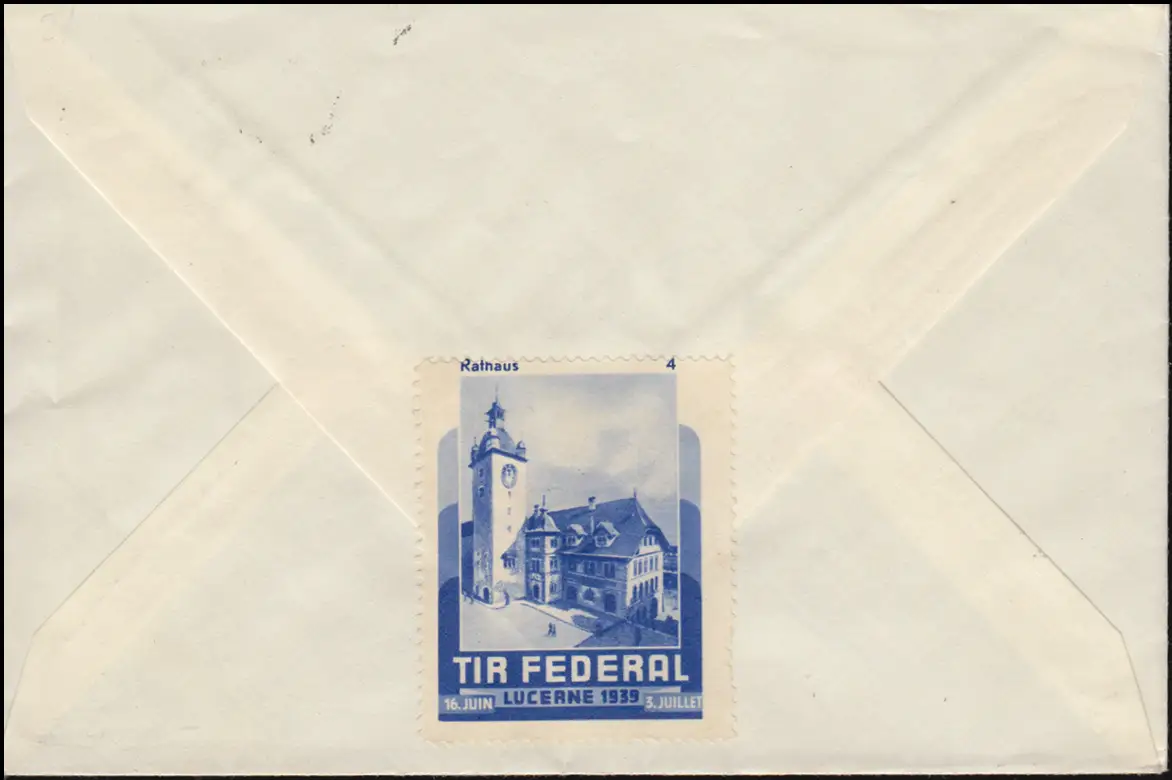 Sonderstempel ZÜRICH SCHWEIZERISCHE LANDESAUSSTELLUNG PAVILLON, rückseitig blaue Vignette "TIR FEDERAL Rathaus Luzern 1939", Ankunftsstempel LUZERN 6.5.39