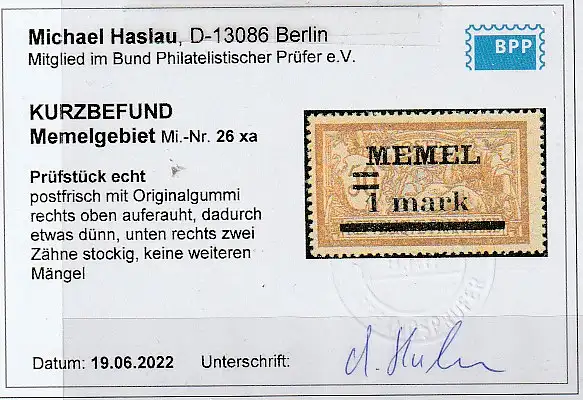 Memel: Michel-Nr. 26 xa, ** (MNH), KBefund