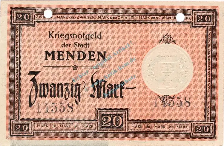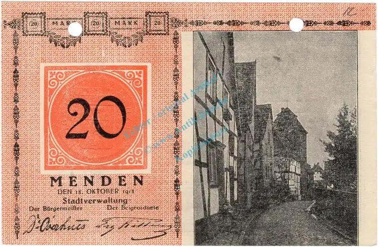 Menden , Banknote 20 Mark Schein unc-kfr.E Geiger 359.03.a , Westfalen 1918 Grossnotgeld