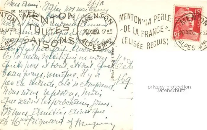 Menton_Alpes_Maritimes Vue générale Menton_Alpes_Maritimes postalisch gelaufen 1950 Erhaltung siehe scans [FriedD77] Frierer