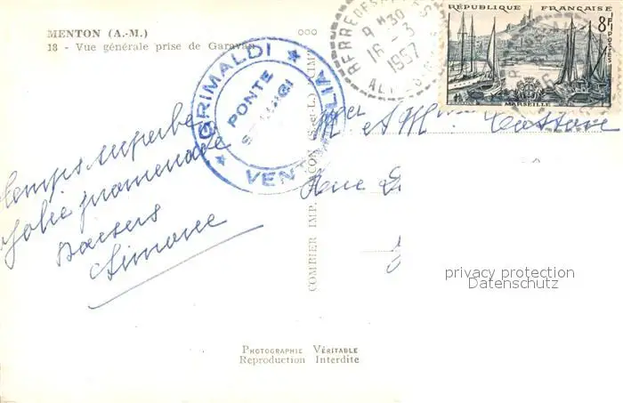 Menton_Alpes_Maritimes Vue générale prise de Garavan Menton_Alpes_Maritimes postalisch gelaufen 1957 Erhaltung siehe scans [FriedD77] Frierer