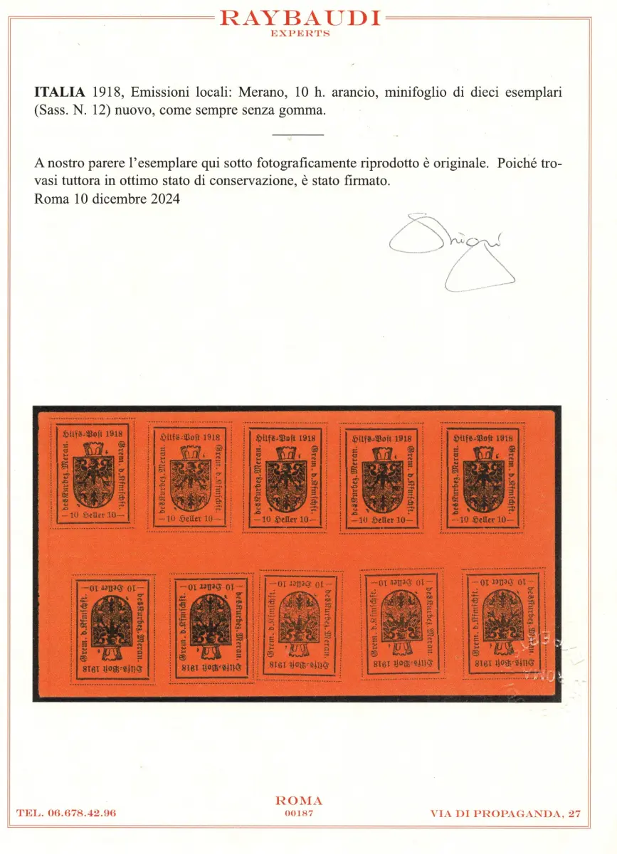 Ohne Gummi - M - Meran 10 Heller Wappen orange IV. Typ Nr. 12 wunderschöner Minibogen mit zehn Exemplaren neu perfekt, wie gewohnt ohne Gummi - Selten - Für den Fachmann Cod. 2183/Web
