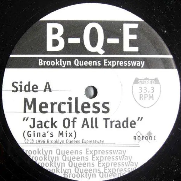 12" Maxi Merciless - Jack Of All Trade, neutrales Cover; no sleeve, Zustand Platte VG+; Made in United States 1996 Brooklyn Queens Expressw BQE001, Tracks Gina's Mix, KRS-1 Mix,