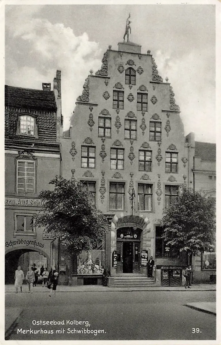 Merkurhaus mit Schwibbogen in Ostseebad Kolberg Pommern Postkarte AK
