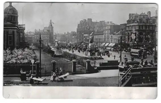 Metall-AK Manchester, Piccadilly, Strassenbahn