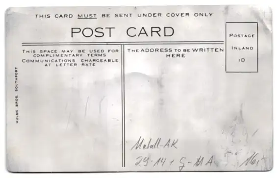 Personenbezogene Daten auf der Rückseite der Karte wurden durch blauen Textmarker unkenntlich gemacht. Die blauen Stellen sind auf die Vorderseite durchgeweicht und wirken sich negativ auf das Postkartenfoto aus