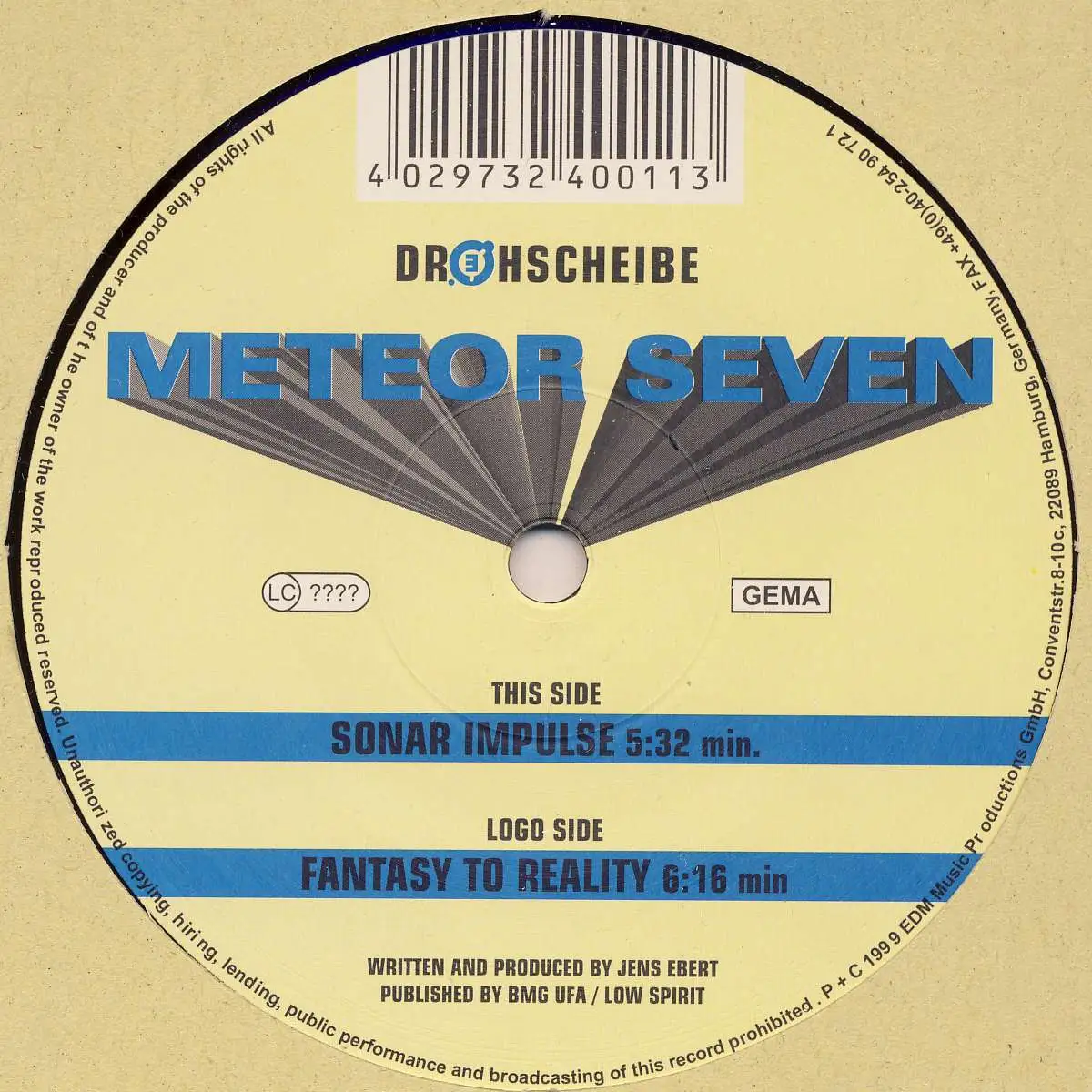 12" Maxi Meteor Seven - Fantasy To Reality, Einheitscover der Plattenfirma, Zustand Platte M- Hülle M-; Made in Germany 1999 Drehscheibe 001, Tracks 6:16, Sonar Impulse 5:32