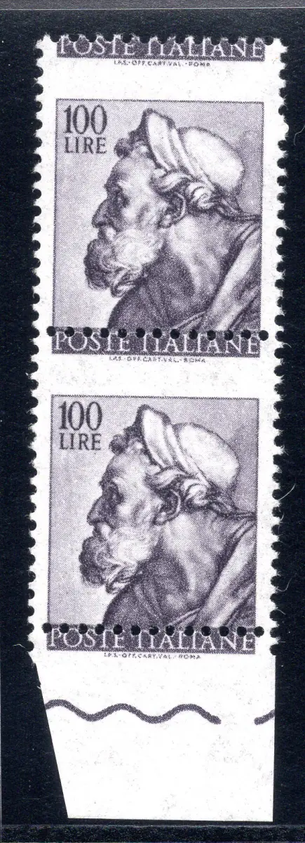 Michelangelo Lire 100 Sterne IV Sorten Italienische Post in hohem Vollgummi - Michelangelo Lire 100 Nr. 912/Im (Sterne IV) vertikales Paar b. von f. mit stark nach oben verschobener Verzahnung; Schriftzug Poste Italiane oben - Schön und ungewöhnlich - Kat. 280 Code 588/8