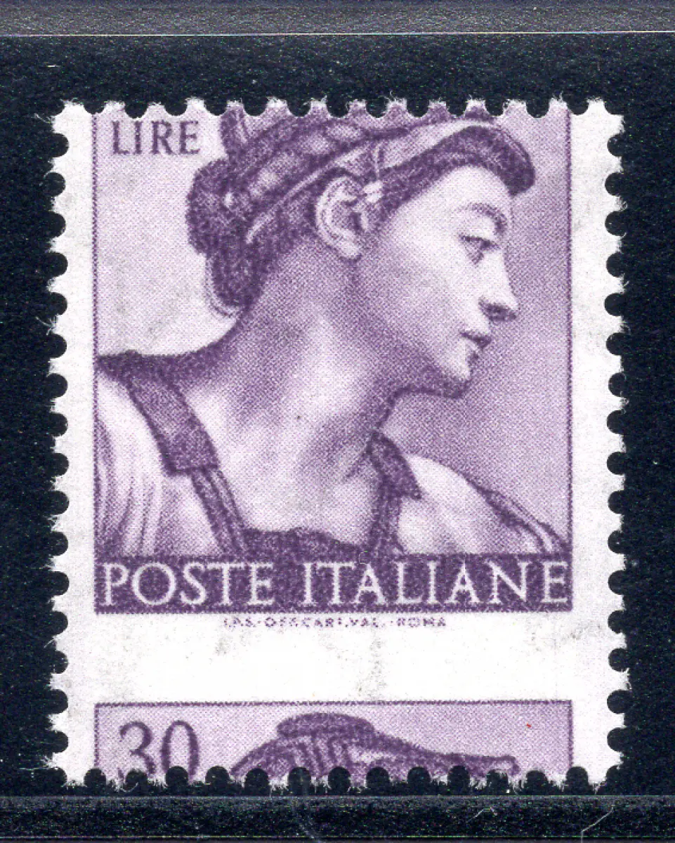 Michelangelo Lire 30 Sorten Ziffer 30 unten statt oben Vollgummi MNH - Michelangelo Lire 30 Nr. 905m Viertel mit stark nach unten verschobener horizontaler Verzahnung, Ziffer 30 nach unten statt nach oben - Ungewöhnlich bei so relevanter Verschiebung Code 580/8