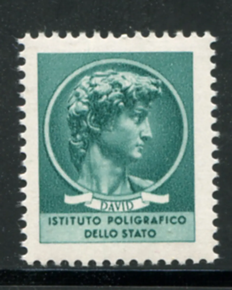 Michelangelos Davidskopf - Grün bedruckter Proof gelbes Fluoreszenzpapier Vollgummi - Michelangelos Davidskopf - grün bedruckter Proof gelbes Fluoreszenzpapier, Blockverzahnung - weißer Gummi (Kat. Griffe Nr. 10, Variante noch nicht erwähnt) - Interessant, nicht zu verwechseln mit der gleichen Art und Farbe, aber mit gestreiftem gelbem Gummi, der durchaus üblich ist - Kat. euro 180 Code 527/8