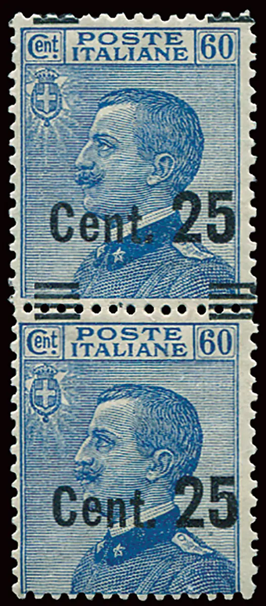 MNH Vollgummi - Michetti Cent. 25 von 60 Nr. 178 vertikales Paar mit stark vertikal verschobenem Aufdruck (zu Pferd) - Ungewöhnlich Cod. 148/15