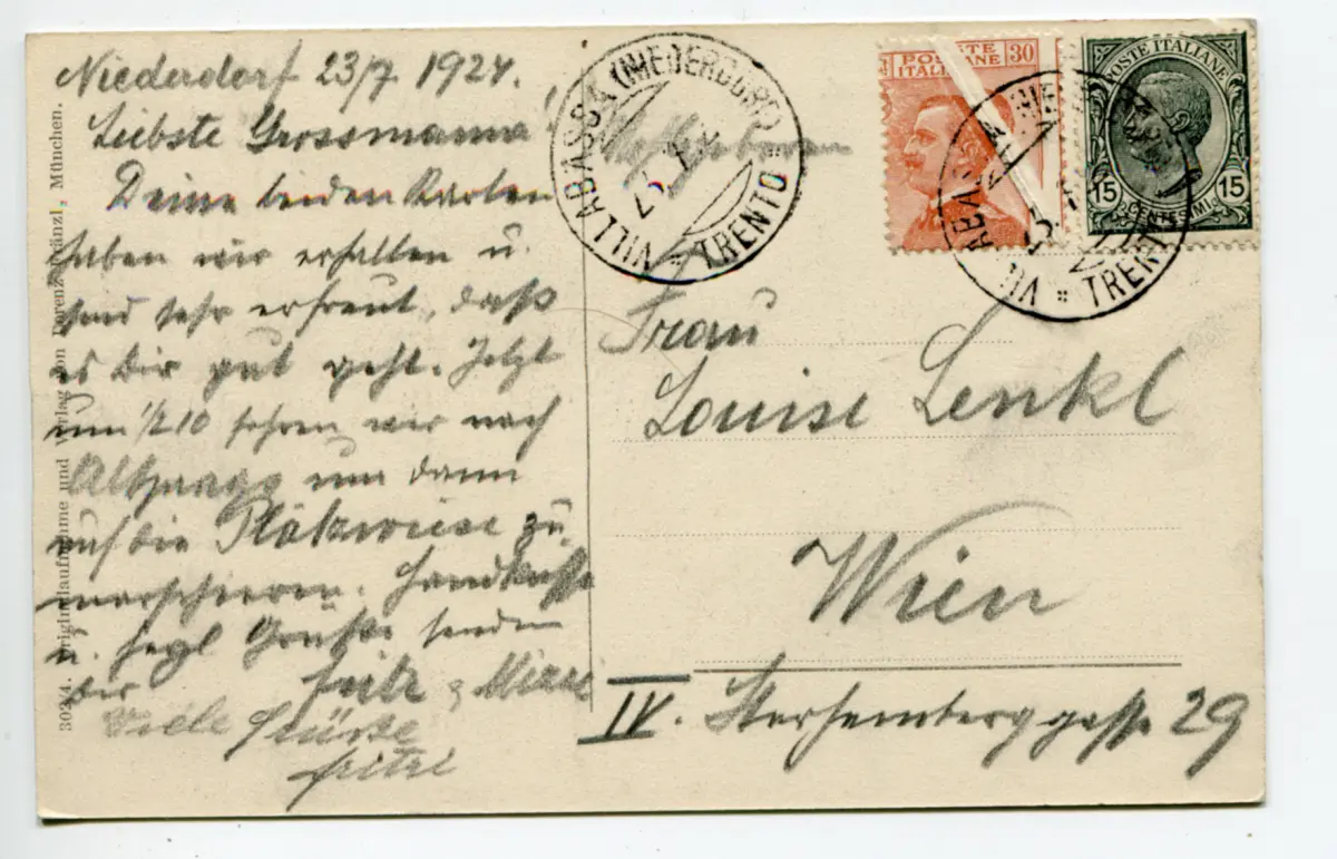 Michetti Cent. 30 verschiedene auffällige Papierfalte beim Drucken - Michetti Cent. 30 Nr. 127 mit auffälliger Papierfalte beim Druck, auf Postkarte nach Wien mit Beilage Nr. 108 - Ungewöhnlicher Postgebrauch dieser auffälligen Sorte - Seltener Code 256/3