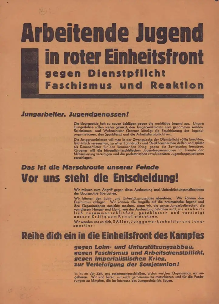 Titel: Arbeitende Jugend in roter Einheitsfront gegen Dienstpflicht, Faschismus und Reaktion. [Flugblatt]
