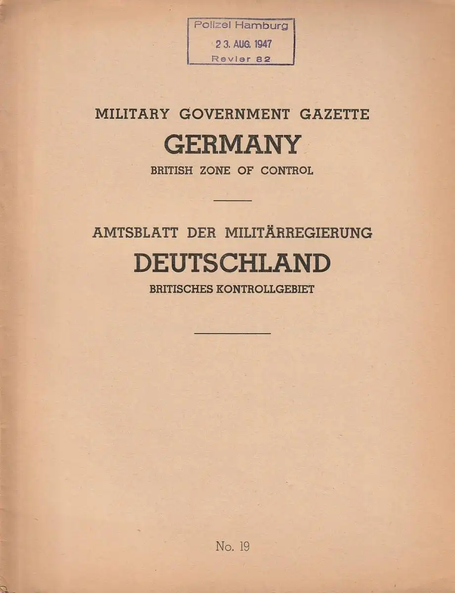 Militärregierung Deutschland: Military Government Gazette Germany British Zone of Control No. 19 Amtsblatt der Militärregierung Deutschland Britisches Kontrollgebiet.