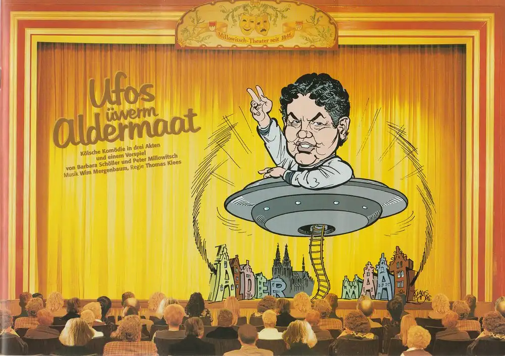 Millowitsch - Theater, Peter Millowitsch, Barbie Millowitsch, Klaus Böhle, Eberhard Azg ( Bühnenfotos ): Programmheft UFOS ÜWERM ALDERMAAT.