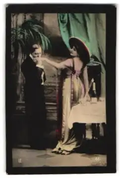 Mini-AK Dame mit grossem Hut bekommt einen Handkuss vom Verehrer