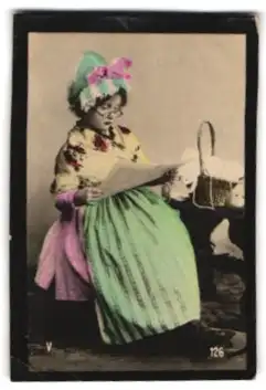 Mini-AK Ein junges Mädchen verkleidet sich als ältere Dame und liest Zeitung