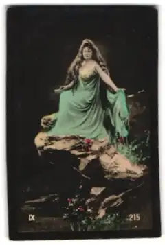 Mini-AK Frau auf einem Felsen in fliessendem Kleid