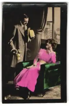 Mini-AK Junger Mann im Mantel mit Hut und Gehstock besucht eine junge Dame