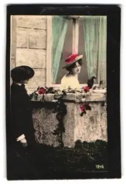 Mini-AK Junger Mann spricht mit einer Frau auf dem Balkon