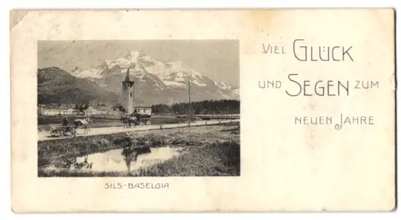 Mini-AK Sils Baselgia, Kirche mit Bergpanorama