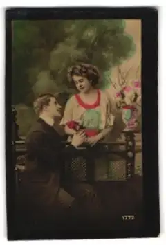 Mini-AK Sitzender junger Mann beim Schäkern mit einer Frau