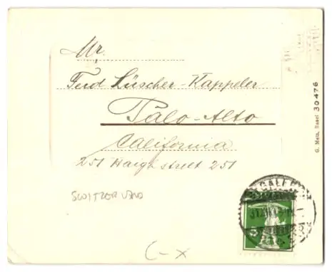 Personenbezogene Daten auf der Rückseite der Karte wurden durch blauen Textmarker unkenntlich gemacht. Die blauen Stellen sind auf die Vorderseite durchgeweicht und wirken sich negativ auf das Postkartenfoto aus