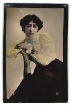 Mini-AK Tänzerin Cleo de Merode in melancholischer Stimmung auf einem Stuhl