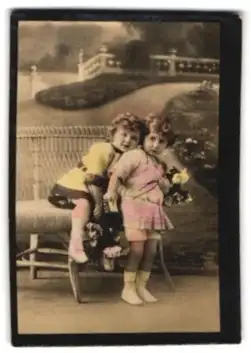 Mini-AK Zwei kleine Kinder Kopf and Kopf auf einer Bank in Studiokulisse