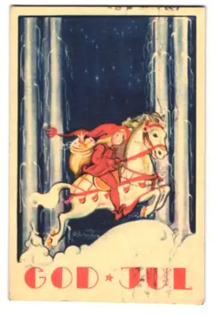 Mini-AK Zwerg reitet durch verschneiten Wald, Weihnachtsgruss
