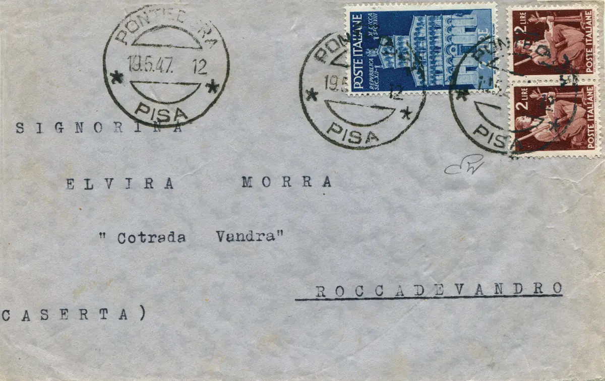 Mittelalter Lire 2 Nr. 567 + Ergänzungen Lire 2 Democratica Nr. 552 auf Umschlag von Pontedera nach Roccadevandro am 19.5.47 - Seltene Verwendung von Zwillingswerten im Tarif in der kurzen Tarifzeit - Umschlag einseitig leicht zugeschnitten Cod. 274/15