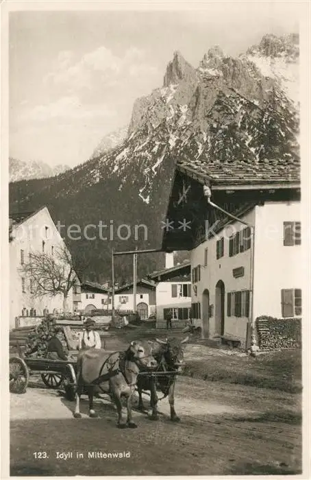 Mittenwald_Bayern Dorfpartie Ochsengespann Mittenwald Bayern postalisch gelaufen 1932 Erhaltung siehe scans [WerneD78] WernPID7