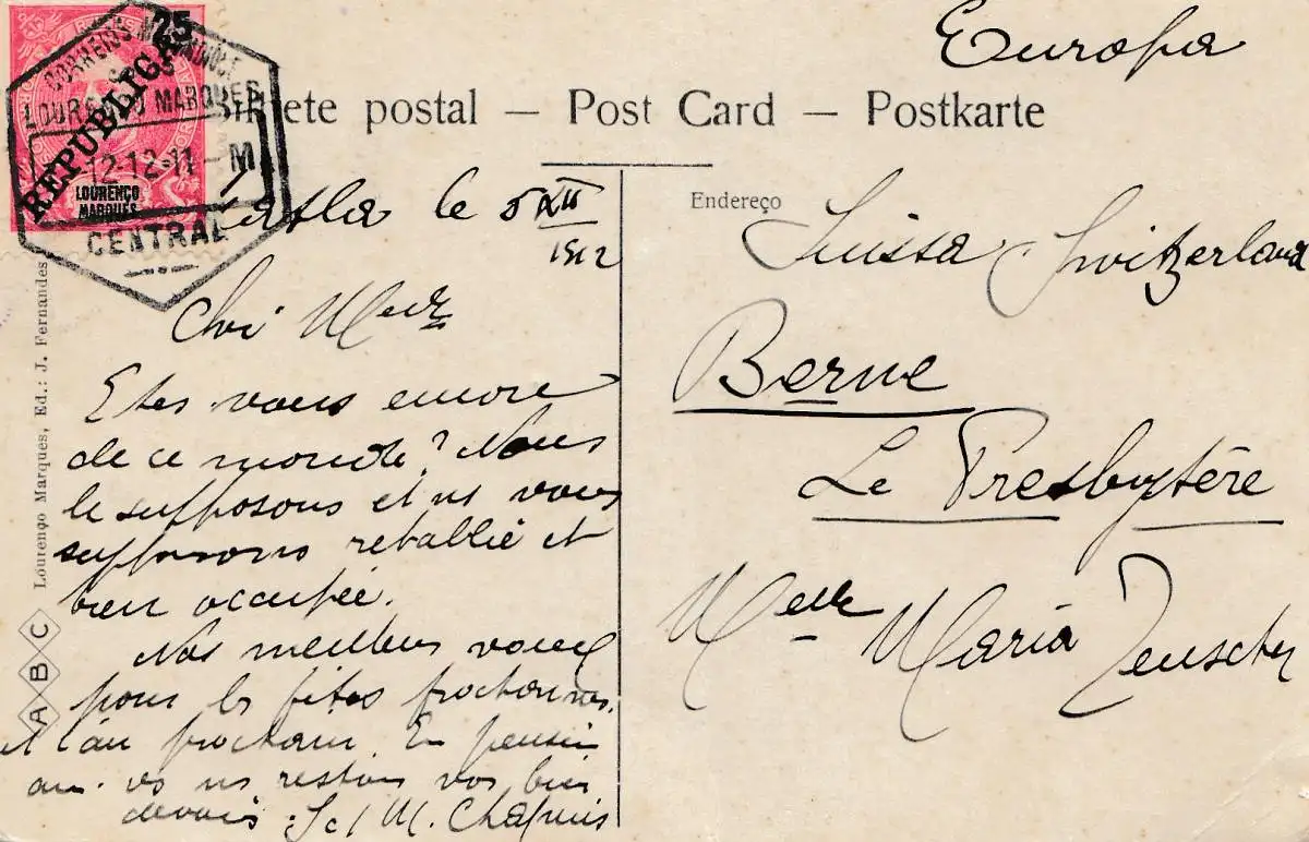 Mocambique 1912 post card Lourenco Marques Avenida D. Carlos to Bern/Switzerland