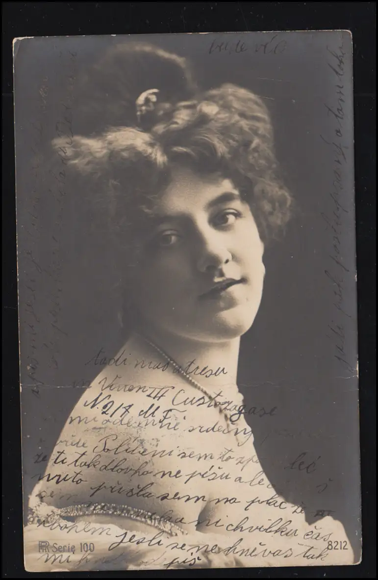 Mode-AK Frau mit dunklem Haar und Haarknoten, WIEN 9.7.1905 nach CERNOVICE 10.7.