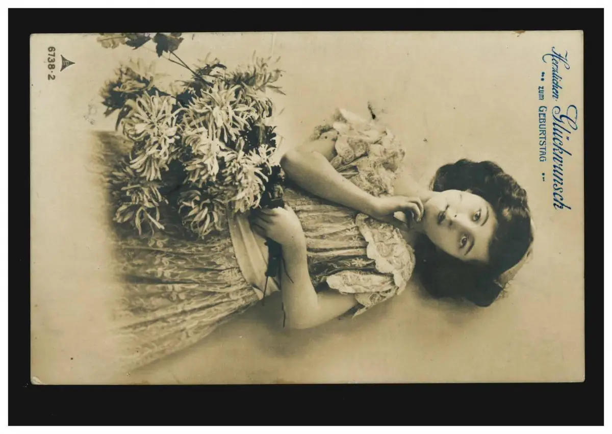Mode-AK Nachdenkliche Frau mit Blumen, FRANFURT - BORNHEIM d 22.9.1911