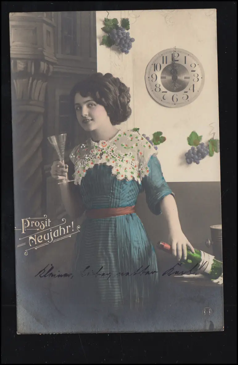 Mode-AK Neujahr Frau blaues Kleid Sektflasche, coloriert, LEISNIG 31.12.1911