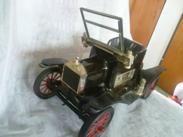 Jim Beam 1974 Modell T Decanter - 1913 Ford Decanter- Regal China Co. Dies ist ein Vintage Dekanter, leer, von einem 1913 Model T Roadster mit Roll-Back-Top, roten Speichenrädern, goldenen Kunststoff-Lenkrädern, Scheinwerfern, Reservoir Kappe und Windschutzscheibe. Zwei rote Ampeln auf jeder Seite. Kennzeichen Nr. D 6661. Markiert auf Porzellan-Flasche Basis und Flasche Top versteckt unter abnehmbaren Kofferraum / Box auf der Rückseite des Autos. Auto ist in gutem Zustand, aber wenn oben ist suspose zu bewegen, es nicht. Sets in einer Schaumstoffplattform, die in Original-Box gewesen wäre. Ungefähr ca. 14 " x 6 3/4".