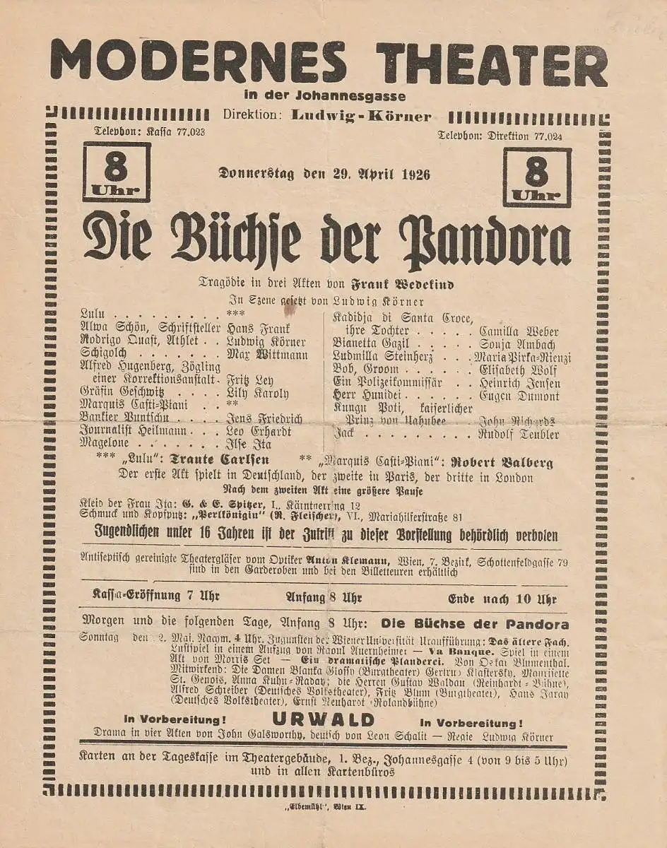 Modernes Theater in der Johannesgasse, Ludwig Körner: Theaterzettel Frank Wedekind DIE BÜCHSE DER PANDORA 29. April 1926.