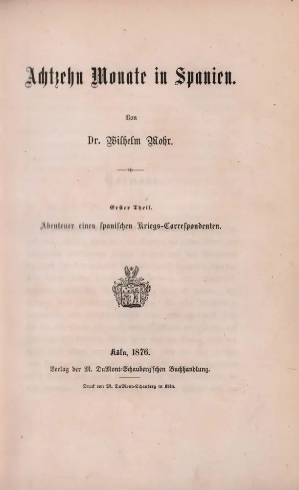 [1] Abenteuer eines spanischen Kriegs-Correspondenten / [2] Frühlingstage in Andalusien und Marokko. - Der Kritiker u. Journalist Wilhelm Mohr (1838-1888) war ein langjähriger Mitarbeiter der Kölnischen Zeitung. Er weilte als Berichterstatter 1874/1875 in Spanien, wo er im Gefolge des Königs Alfons XII (1857-1885) die Feldzüge gegen die Karlisten mitmachte u. von wo aus er 1875 einen Streifzug längs der Westküste von Marokko unternahm (vgl. Meyers Konversations-Lex., 4. Aufl., Bd. 13, S. 1026).- Einband berieben, Papier (aus unterschiedl. Produktionen) leicht gebräunt, vereinzelt schwach stock- u. fingerfleckig, hint. flieg. Vors. fehlt; im Ganzen gutes Exemplar