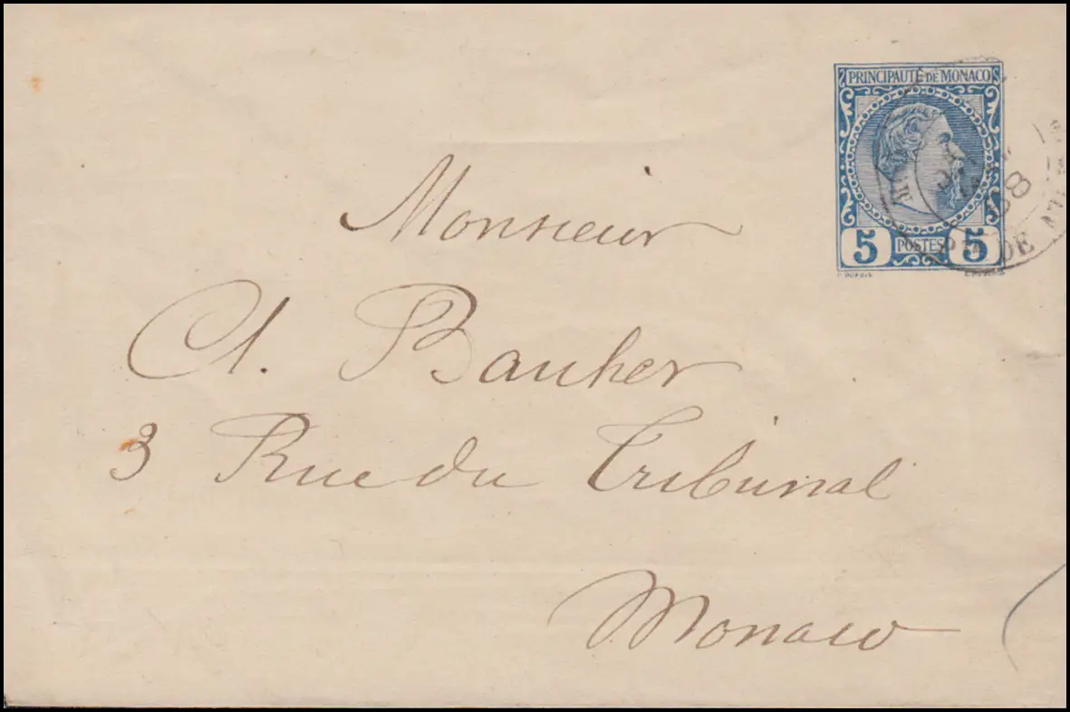 Monaco Umschlag U 1 Fürst Karl 5 C. blau als Ortsbrief MONACO 1888