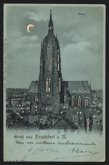 Mondschein-AK Alt-Frankfurt, Der Dom erleuchtet bei Nacht, Halt gegen das Licht