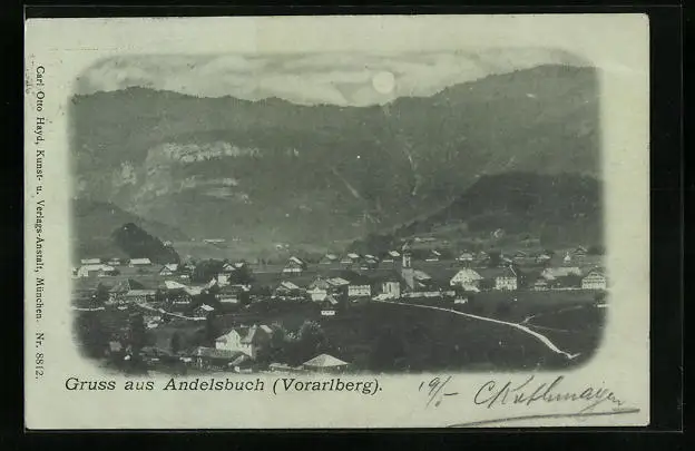 Mondschein-AK Andelsbuch, Ortsansicht gegen Berge
