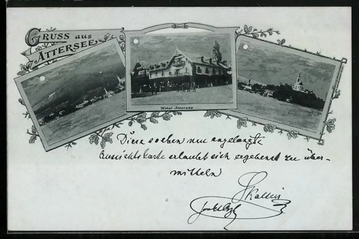 Mondschein-AK Attersee, Hotel Attersee, Ortsansicht im Vollmondlicht