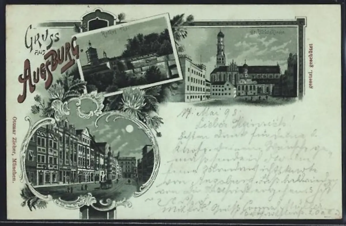 Mondschein-AK Augsburg, St. Ulrichskirche, Rotes Tor, Strassenpartie