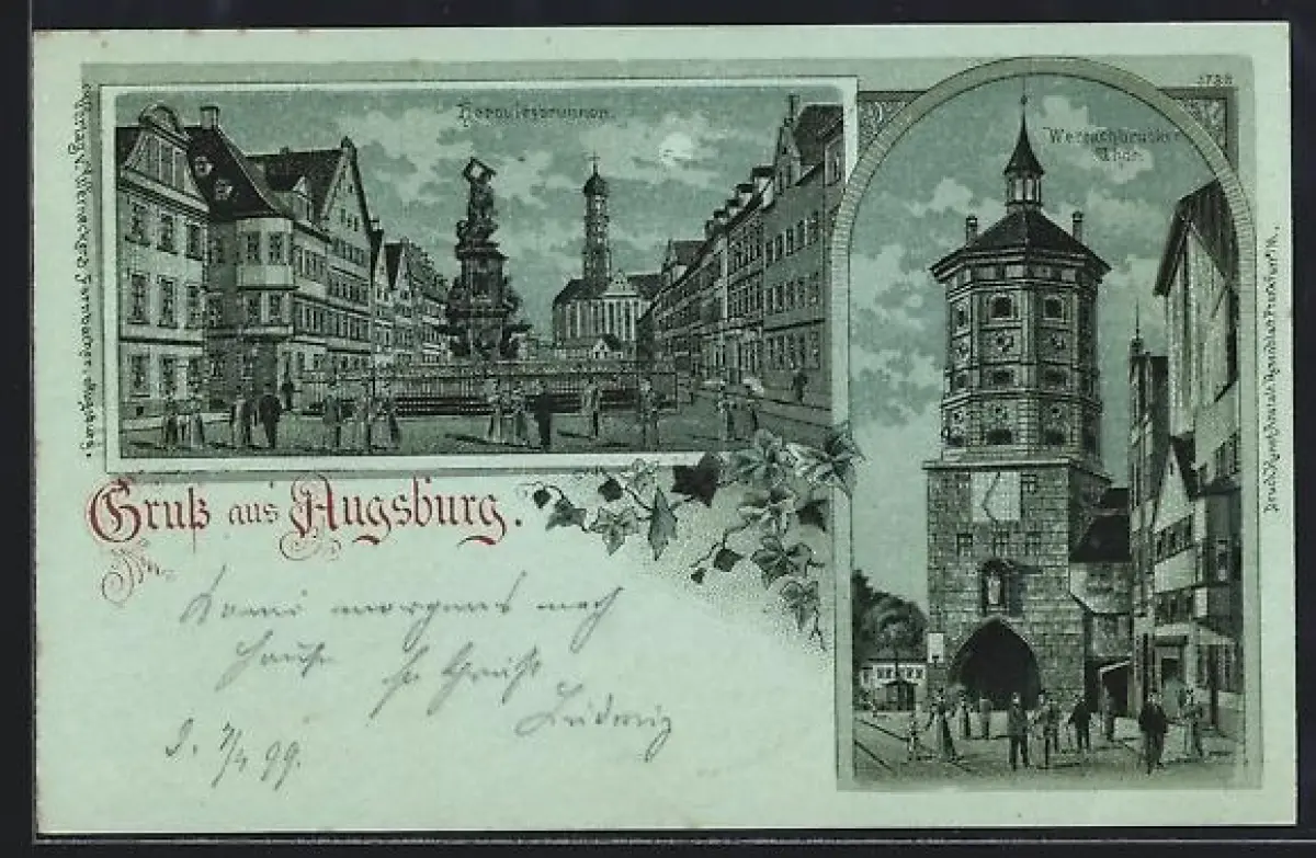 Mondschein-AK Augsburg, Wertachbrucker Tor, Herculesbrunnen