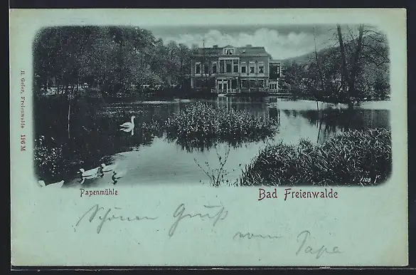 Mondschein-AK Bad Freienwalde, Hotel und Restaurant Papenmühle mit Schwanenteich