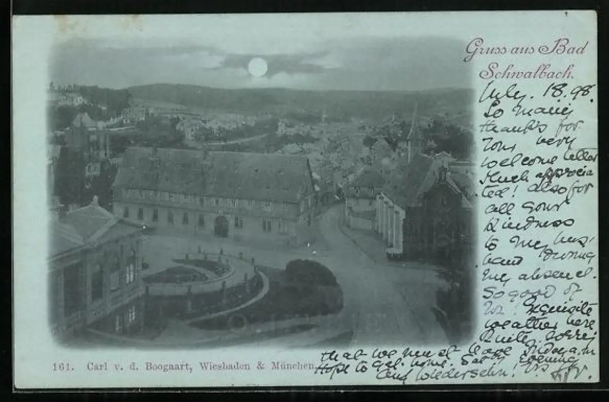 Mondschein-AK Bad Schwalbach, Teilansicht des Ortes mit Umgebung