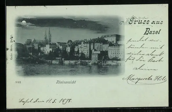 Mondschein-AK Basel, Rheinansicht bei Nacht