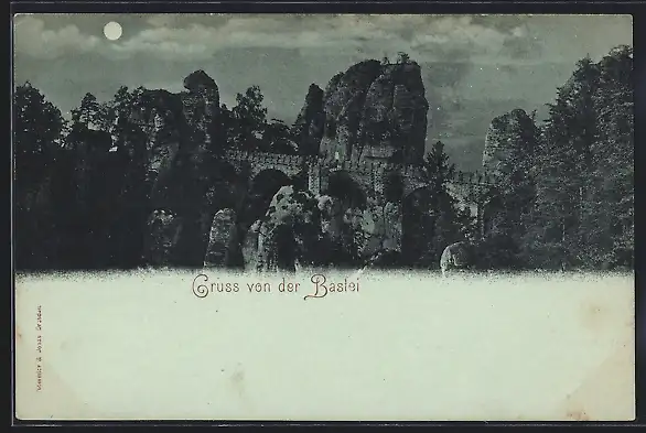 Mondschein-AK Bastei / Sächs. Schweiz, Felsen und Eisenbahnviadukt