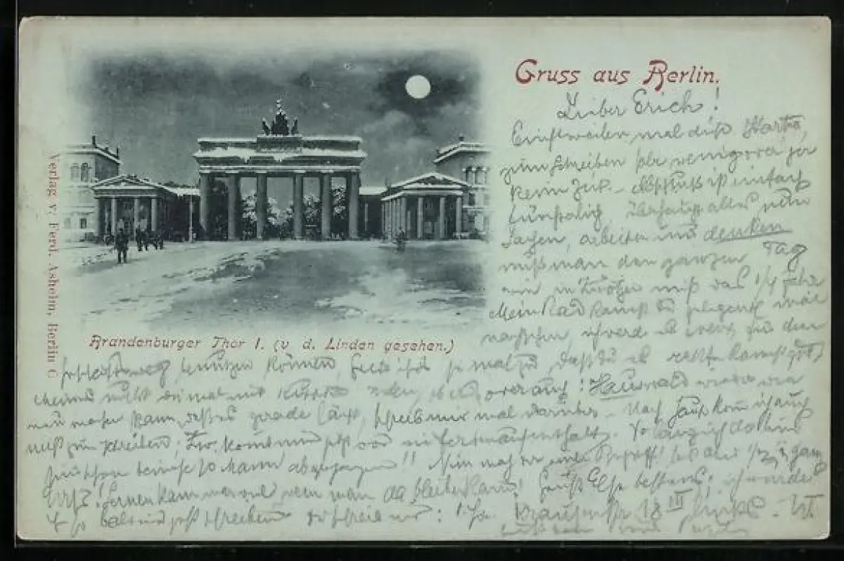 Mondschein-AK Berlin, Brandenburger Tor v. d. Linden gesehen im Winter